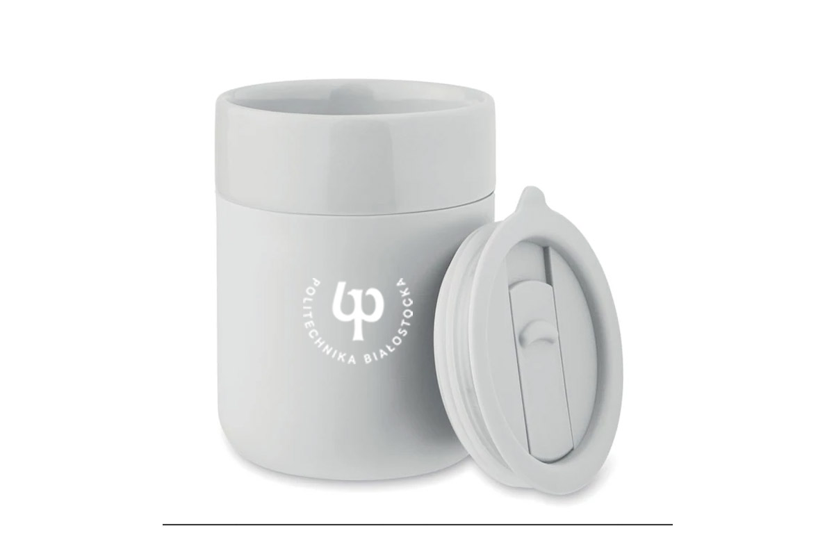• Ceramiczny kubek ze zdejmowalnym silikonowym rękawem i pokrywką z PP.